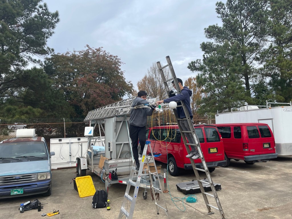 After several tests on campus, we were finally ready to install in November. Finding a place to locate the trailer was not easy but we were lucky to find a nice open spot with space for our solar panels and a clear path for the telescoping tower.